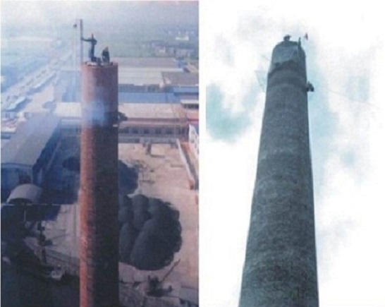 上图展示的烟囱拆除加高项目是我司13年中旬完成的项目。该公司一共三座烟囱,其中两座拆除,留下这座继续使用,经过加高后的烟囱已经正常投产。