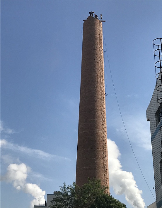 该烟囱高度60m,底部直径6.5m,第1层平台一下以下为混凝土结构、上部为砖砌外分结构(十分罕见),因腐蚀严重,且顶口裂缝严重,呈大喇叭敞口状,随时有崩塌可能,现拟将上部砖结构拆除。