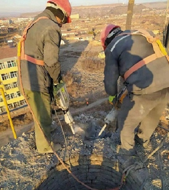 烟囱筒壁:在筒身内部达设脚手架,施工人员在脚手架上作业,用空压机打成小块,在用氧气割掉钢筋。下料:在烟囱内壁下料。