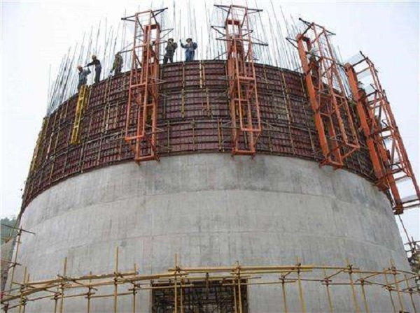 移置式模板的中心对烟囱几何中心的误码率差不超过5mm,模板的下缘同已浇混凝土搭接约为100mm,模板接触混凝土的一面在每次拆移后,及时清除模板表面的浆灰,并涂刷脱模剂。