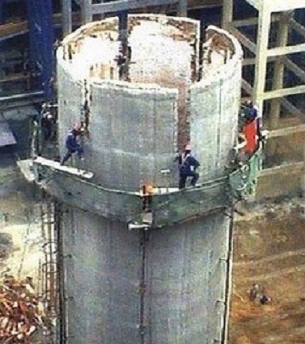 (3)施工人员立在脚手架上,安全带挂在钢管上后,用风镐、手锤由外向内将筒体逐块拆除,使碴块全由筒体内部落下;