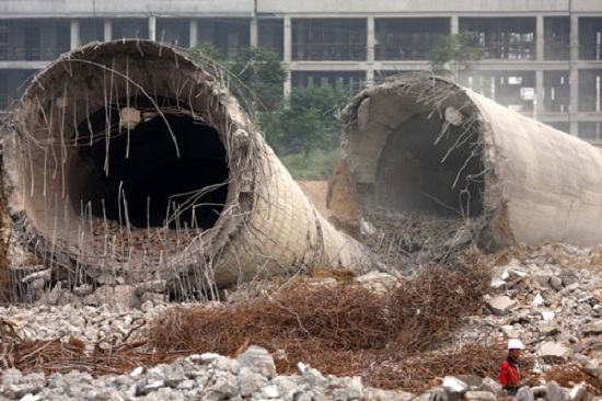 烟囱拆除工程的主要工具有:挖掘机,液压捣碎器,千斤顶,大锤等。