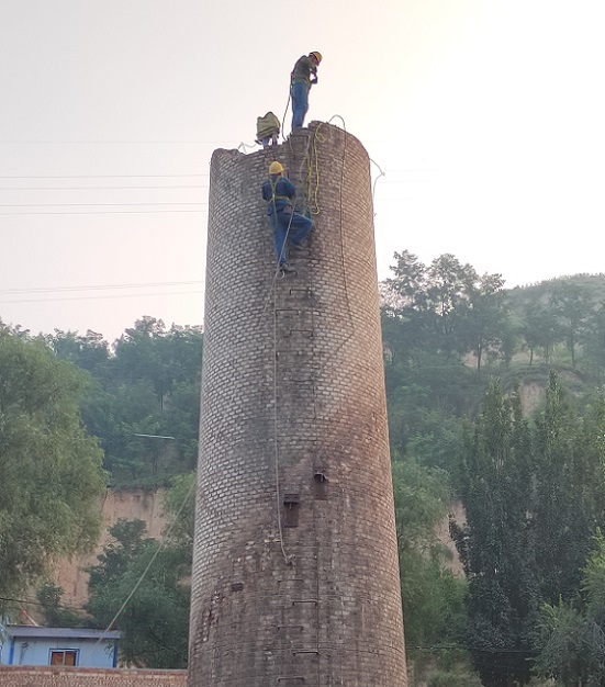 9、枣庄烟囱拆除公司施工前组织人员对原有烟囱砼外观结构、烟囱的爬梯和钢平台现场实际质量进行检查加固,确保施工时人员上下的安全性。