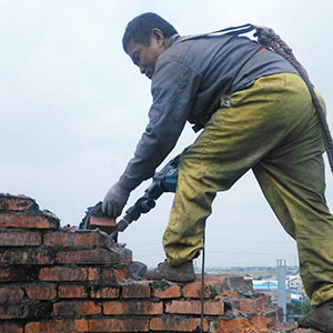 吕梁烟囱人工拆除新闻报道:清晨阳光映照下,这绝对是一幅壮美的剪影:31岁的河南籍民工张宏民扎在砖宽的烟囱沿上,抡起三尺多长的铁锤挨个砖敲打,敲完一块砖就挪一步。他就这样围着直径约2米的烟囱筒一圈一圈地转。在相当于8层楼的高空,张宏民身上惟一的防护措施只有一条用帆布制的白色安全带,安全带的一端钩在烟囱爬梯的扶手上。远远望去,他的每一步都走得很踏实,给人的一种错觉是,那两只脚不是站着而是抓在烟囱沿上,同时通过放慢站起、蹲下和抡锤的动作来保持平衡。